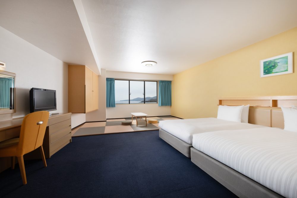 这是一个宽裕的高级双床,是一个连高高度和翻身都放心的禁止鞋的房间。床是为了方便双床睡,非常适合带着孩子的好莱坞类型。