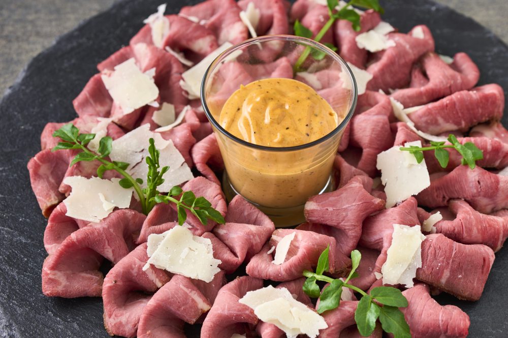 ローストビーフを食べやすいカルパッチョ仕立てに。